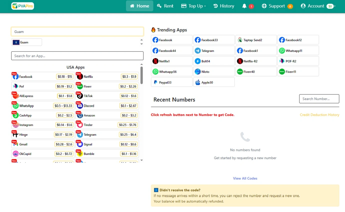 Receive SMS Online in Guam, No SIM Required, with PVAPins starting free, switching to instant activations, or renting for ongoing OTP access. Fast and privacy-friendly.