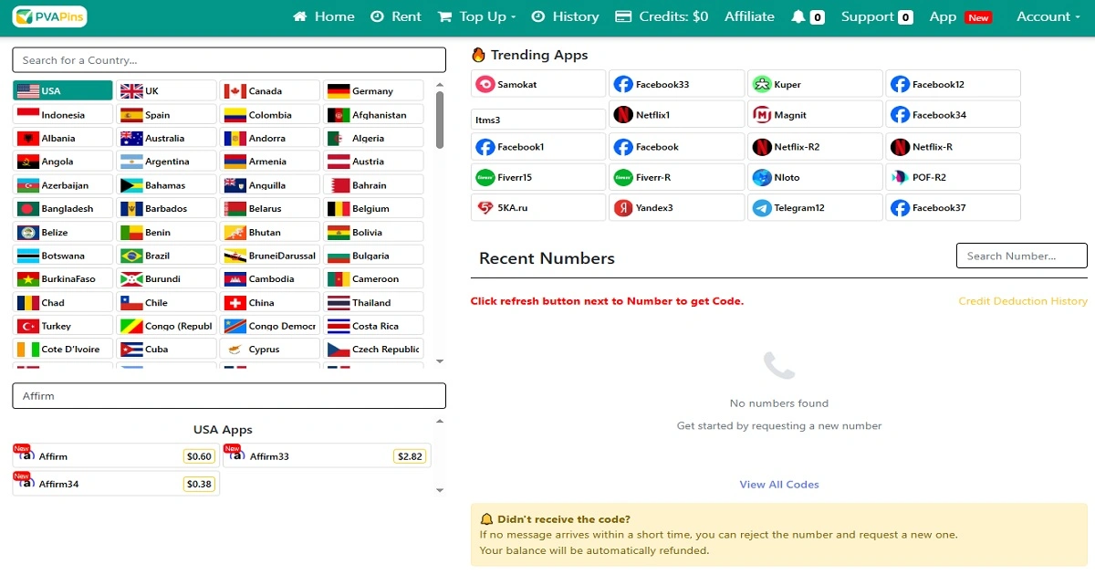 PVAPins supports 200+ countries, and where available, you can choose private/non-VoIP options, which are super helpful for short-code apps like Affirm.