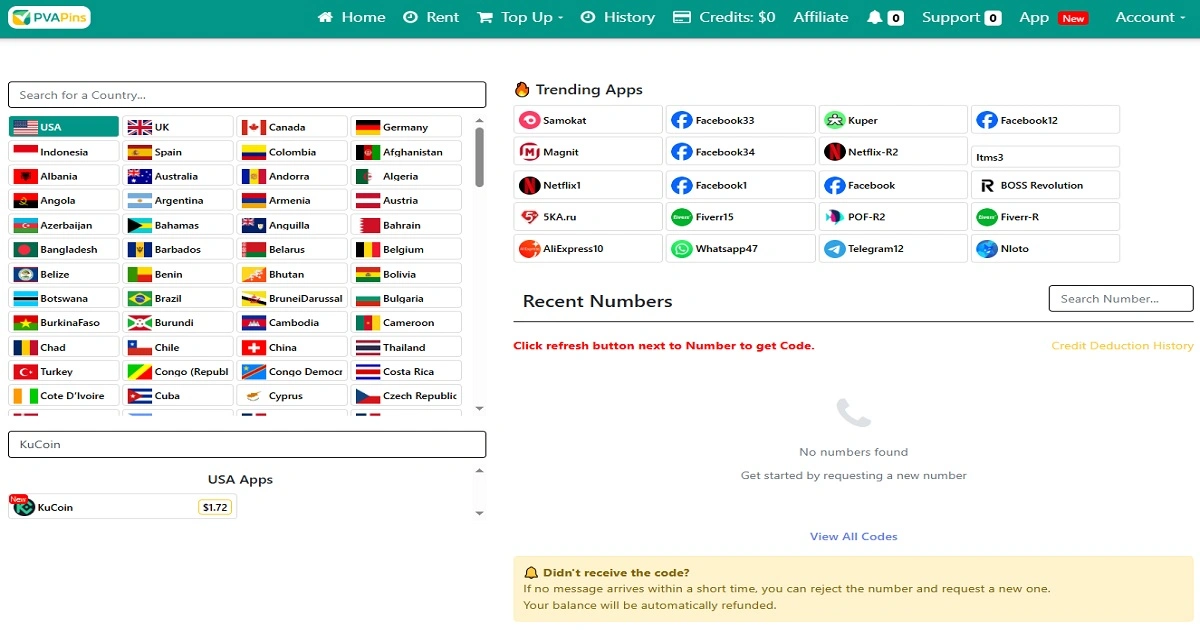To complete verification without exposing your primary phone, you can use PVAPins to get a KuCoin-friendly virtual number. You create a PVAPins account, pick a number in your preferred country, paste it into KuCoin’s phone field, and wait for the OTP to show up in your PVAPins inbox in real time. For quick tests, a one-time activation works; for serious long-term trading, a rental number is way more comfortable.