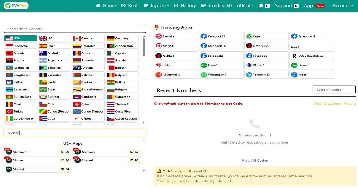 PVAPins gives you two main ways to grab a temporary phone number for Monzo: