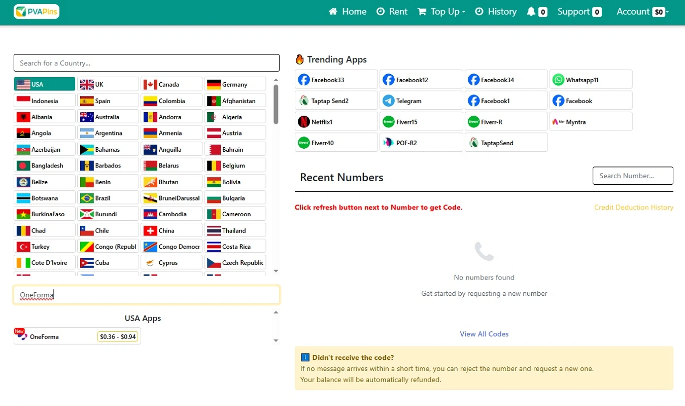 With PVAPins, the flow is simple: you pick a country, grab a OneForma-friendly number, request the OTP, and read the code in your dashboard or Android app: no new SIM, no extra device.