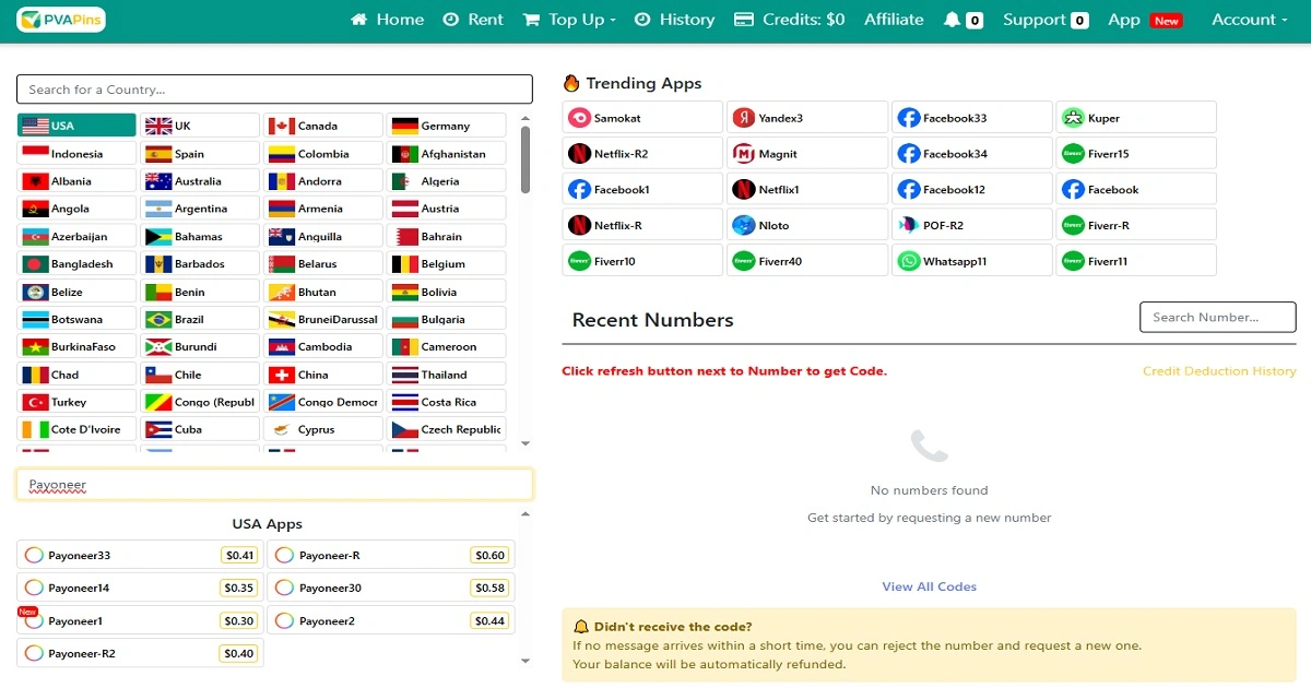 PVAPins gives you SMS-capable numbers across 200+ countries. You can start free if you want a quick OTP, then go instant or rental if you need more reliability.