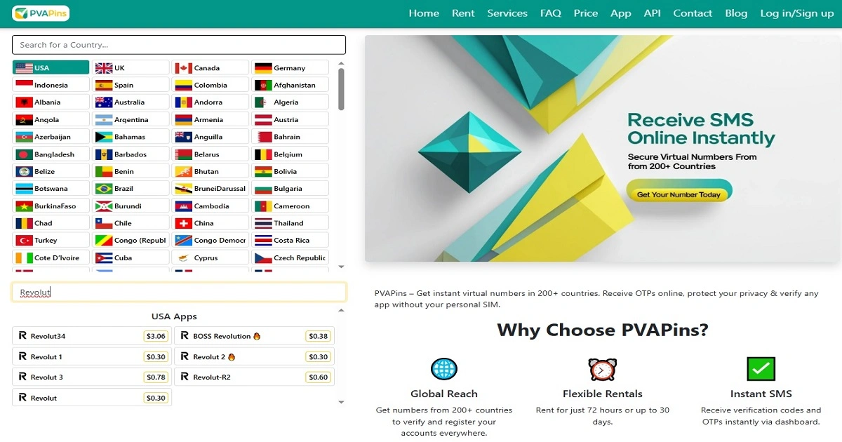 PVAPins gives you private, receive SMS capable numbers across 200+ countries, including non-VoIP/private routes where available. That matters because fintech OTPs can be picky, and private routes usually deliver codes more reliably than shared or overused lines.